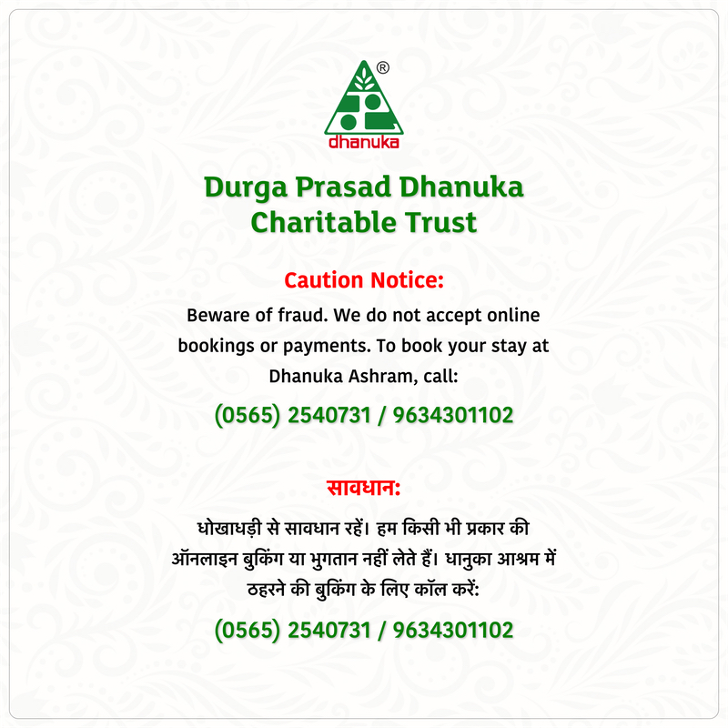 •   धानुका आश्रम द्वारा किसी भी प्रकार की ऑनलाइन बुकिंग नहीं ली जाती